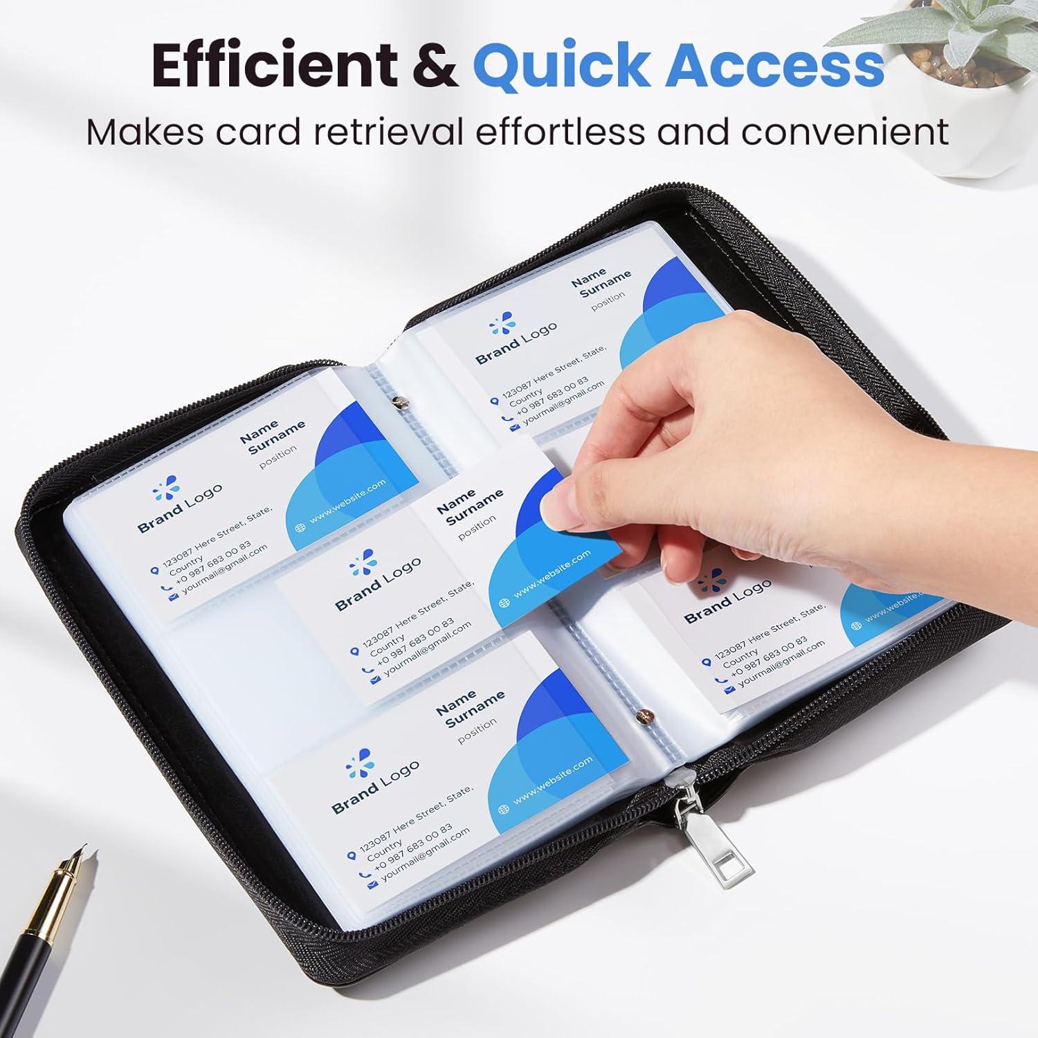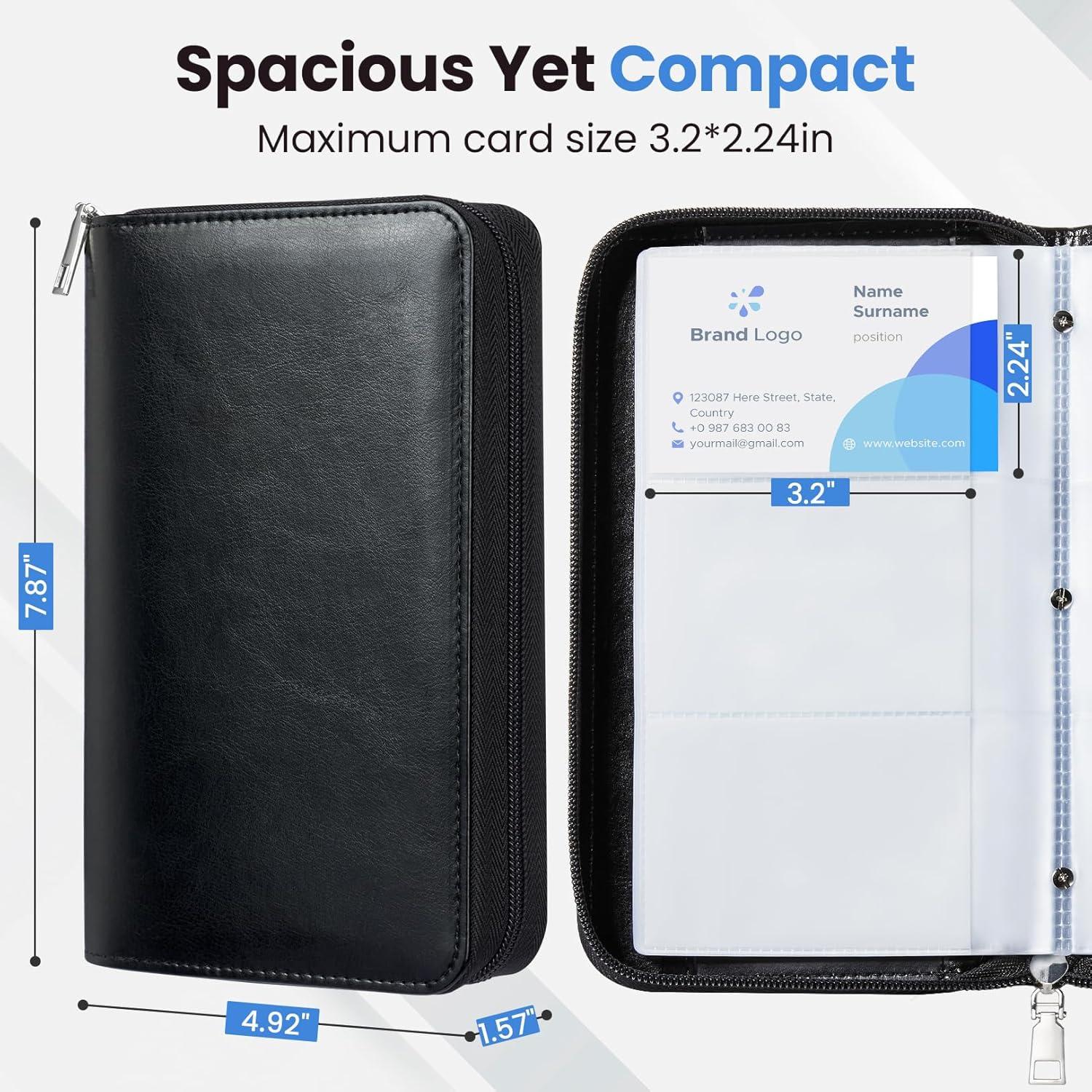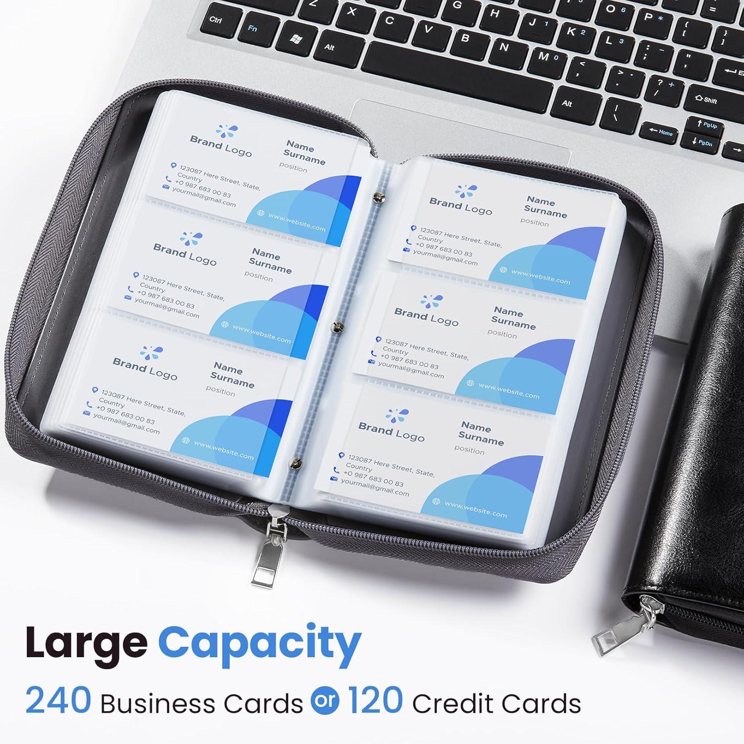 Large 240-Card Capacity: Holds 240 business cards back-to-back or 120 credit cards (including RFID protection). Accommodate standard 3.2″×2.24″ cards with perfect fit. Features a clear interior pocket for notes, IDs, and so on.